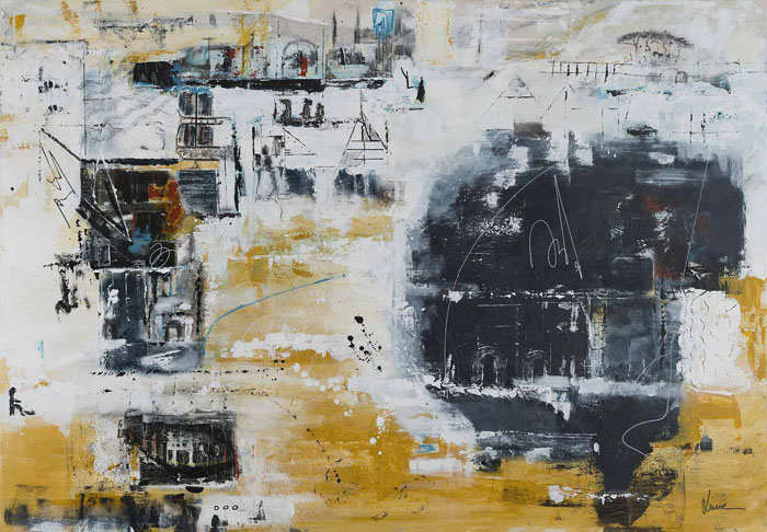 Renacimiento Urbano 2023 Acrílico, ceras y gesso sobre lienzo. 90 x 130 cm.