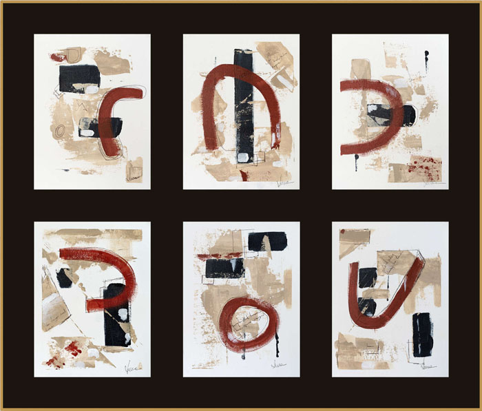 Seis Conexiones - Compo 1 2024 Políptico Acrílico, marcadores y grafito sobre lienzo sobre madera. Enmarcado. 64 x 75 x 5 cm.